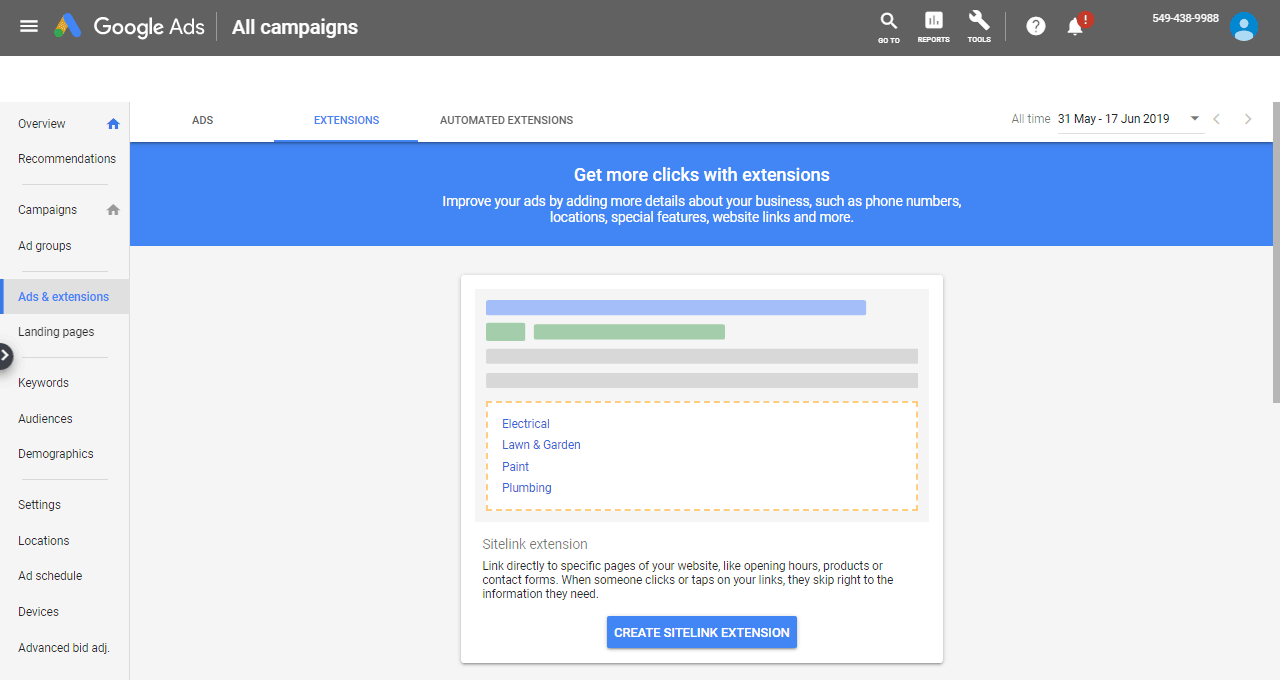 Following is the Ad Extensions component page. Ad Extensions are additional pieces of information that enhance your advertisement to make it more useful for users. Ad extensions normally include phone numbers, additional links of your website, reviews. Normally ad extension did not have any additional charges. You should select ad extensions that will help your advertising campaign to better meet your business goals.
